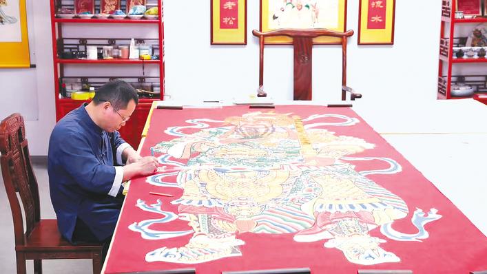 “朱砂要一层层罩染,才能厚重又透亮。”汉吉福创始人、非遗传承人许华波轻抚着丝绢画面,门神甲胄上的烫金在灯光下流转生辉。作为手绘门神技艺的坚守者,他深知这门手艺的慢功夫。