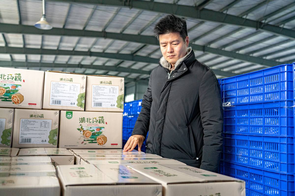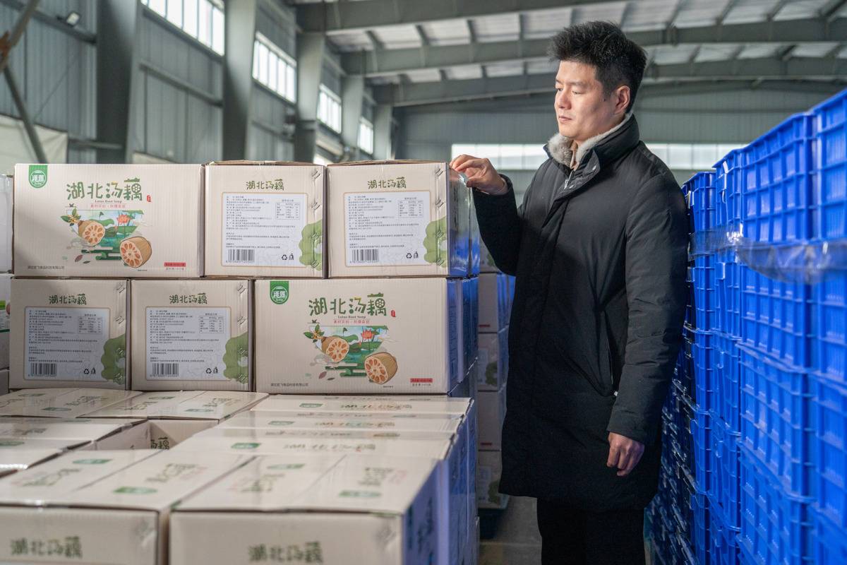 汉川市宏发农业开发有限公司总经理王飞正在查看春节备货情况。(湖北日报全媒记者 王欣 通讯员 蔡青阳 摄)