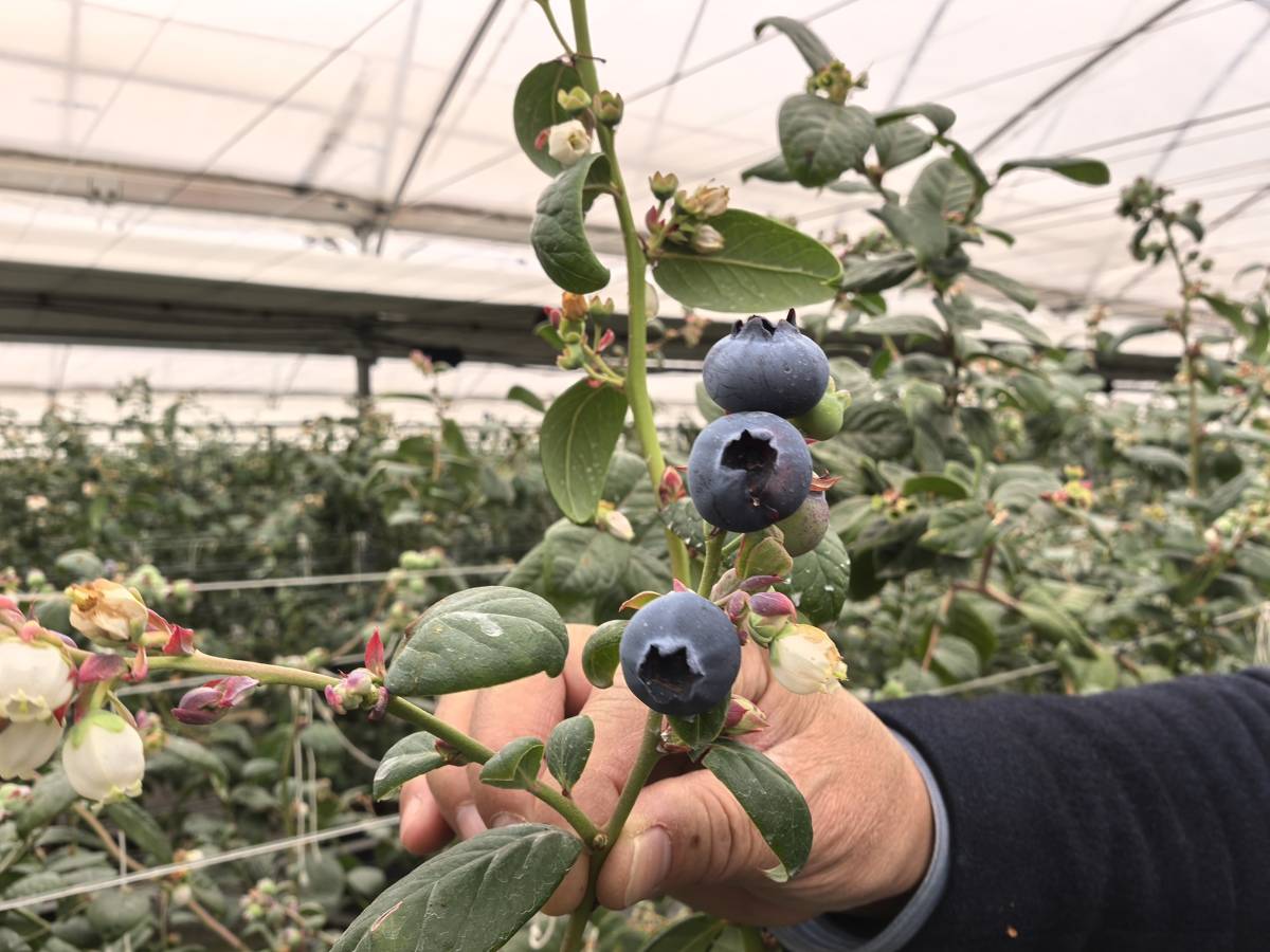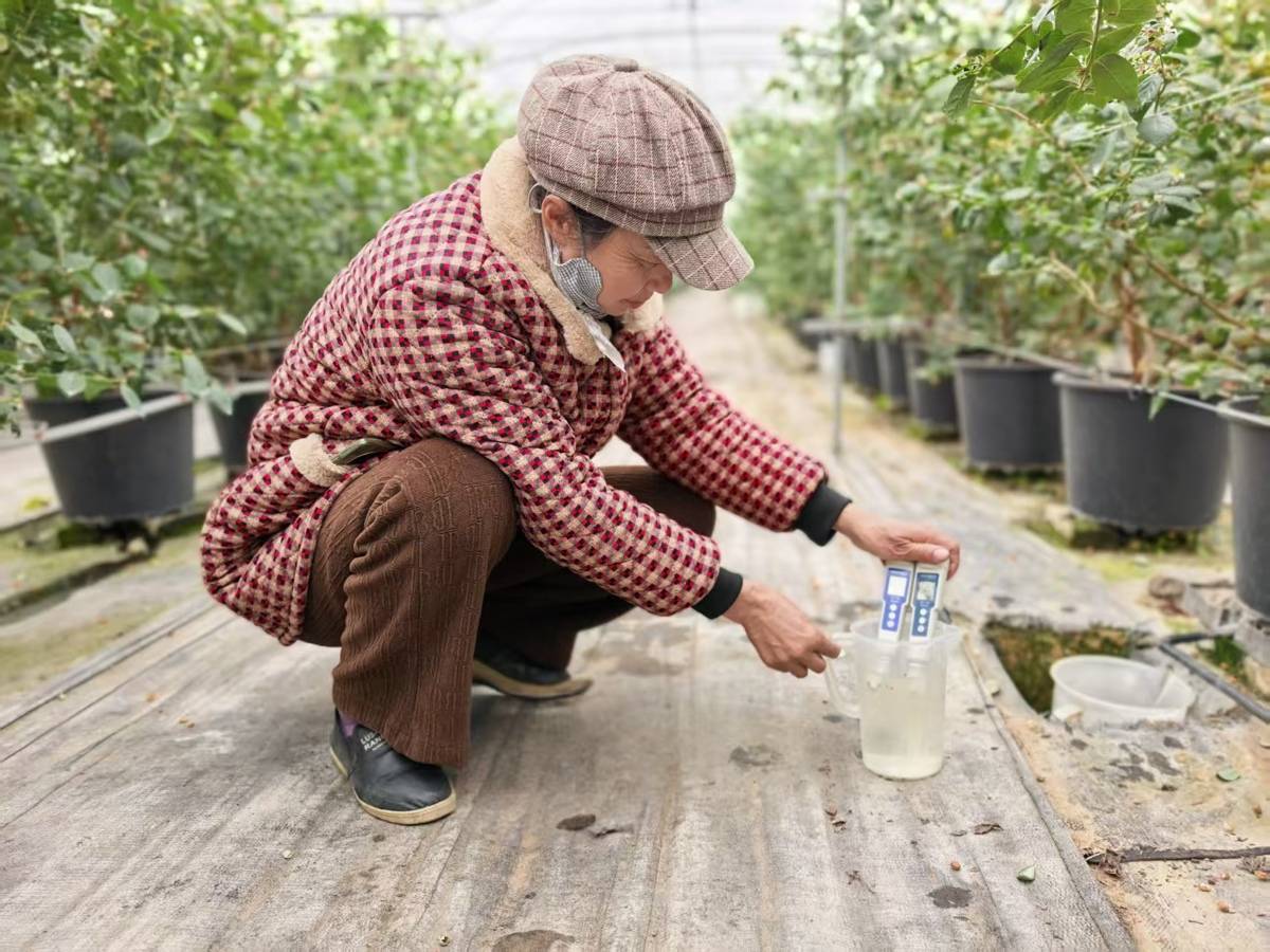 品种好,还要种植好。基地采用全基质加避雨栽培,亩均投入超10万元,总投资1.2亿元。蓝莓种在花盆里,基质从荷兰与上海定制而来;水肥通过以色列一体化系统精准滴灌。技术员崔喜娥每天手持检测笔,巡回测量排液的EC值和pH值,“根据检测结果配餐,每一顿都不能马虎”。