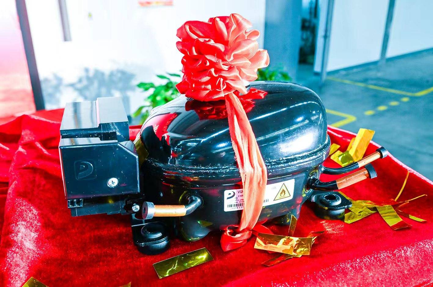 当天,东贝集团党委书记廖汉钢从生产线搬下第5亿台纪念机型——一款新型扁平式压缩机。该压缩机为有效提升制冷设备的使用空间提供了“中国方案”——近年来,随着嵌入式冰箱、车载冰箱等新家电的普及,市场对“高端、节能、智能”需求日益迫切,传统压缩机大体积的痛点逐渐凸显。东贝的研发团队“螺蛳壳里做道场”,通过优化压缩机内部结构布局,成功将产品高度压缩至100mm以下,且制冷效率保持不变。