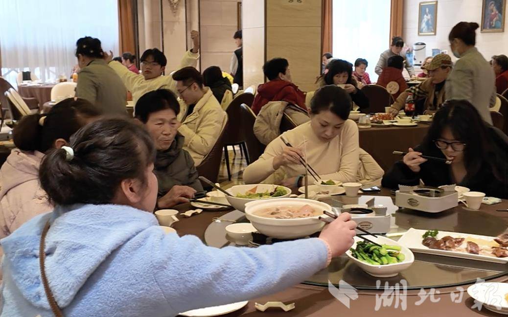 邹桂萍和闺蜜团迎来了一年一度的团年时刻。她们点上排骨藕汤、珍珠圆子、武昌鱼等经典楚菜,这是从小到大的年味记忆,与饱含着她们对团圆与相聚的理解。“圆子象征团团圆圆,鱼寓意年年有余,吃年饭一定要点!”邹桂萍说。