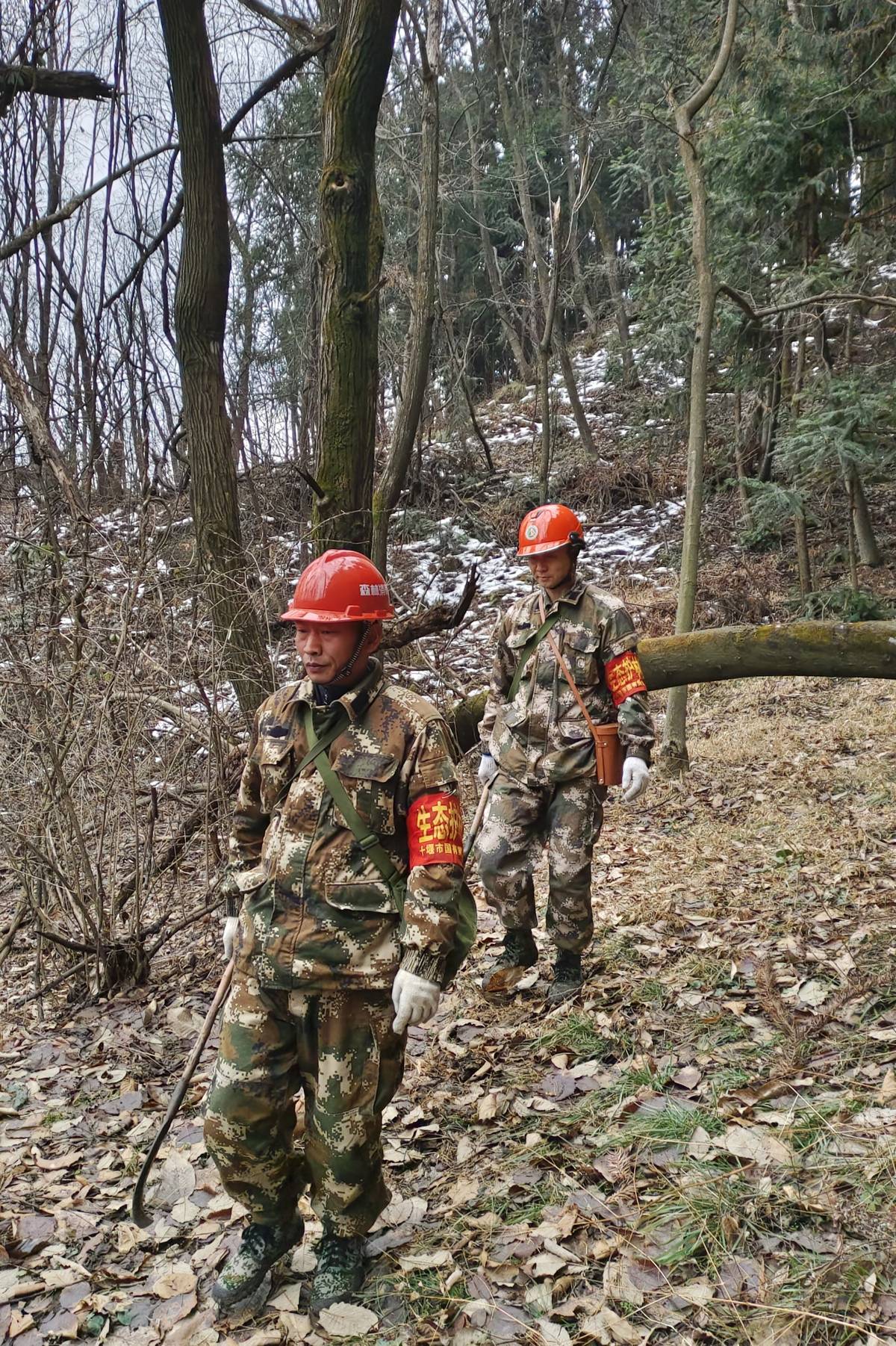 早上8时,十堰黄龙林场老母荒林分区,春寒料峭。湖池管护站护林员梁从贵和工友周明林,已收拾好巡山行囊,即将开始一天的巡山工作。