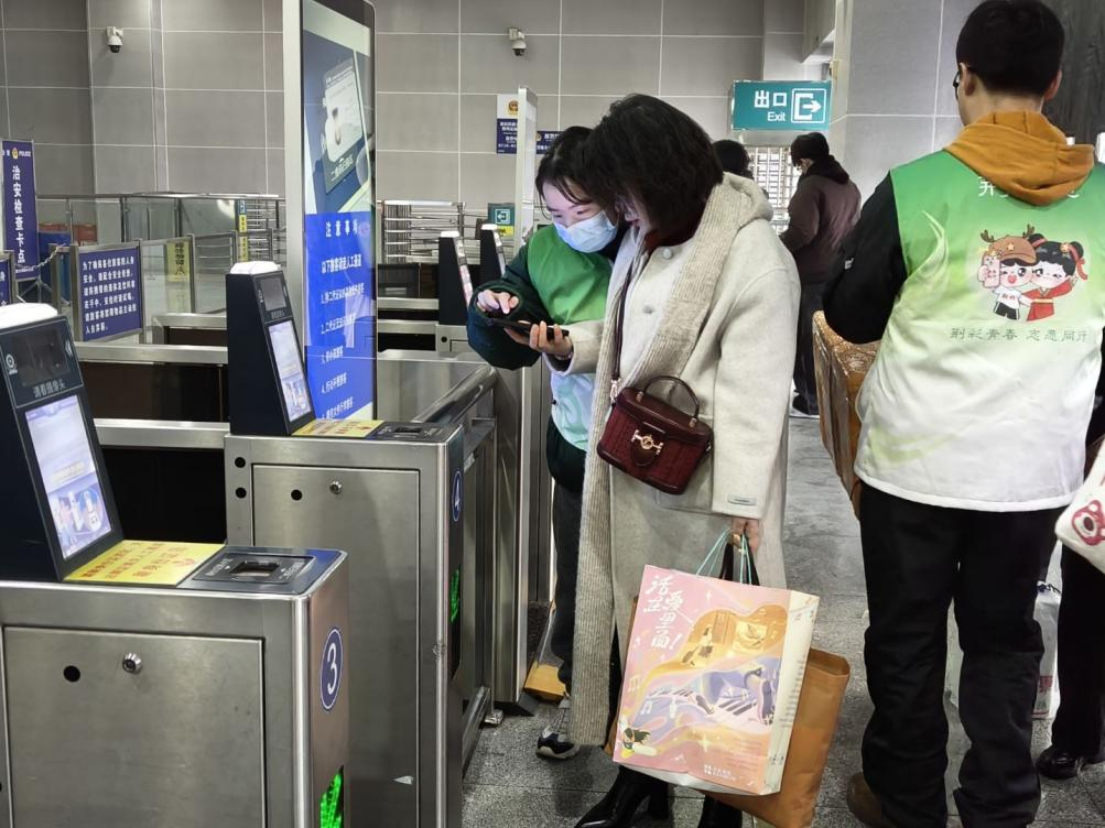 “别慌,换个闸机试试,旁边还有人工通道呢,保证您能上车!”大冶北火车站的青年志愿者引导检票口的乘客有序乘车。