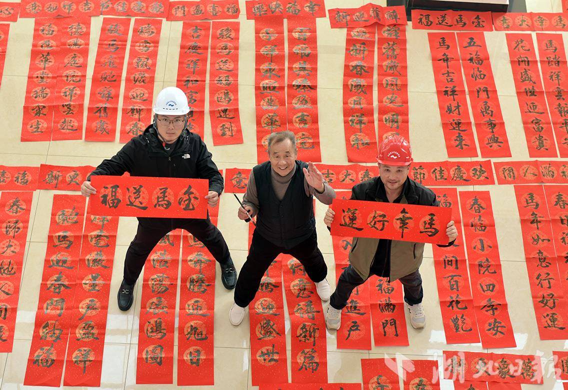 湖北日报讯(通讯员李广彦、王帆)“横批就写金马送福”“我想要一幅万马奔腾的长联,带回去送给我父母”……2月10日下午,湖北碾盘山水利水电枢纽工程建设管理局气氛祥和温馨,红彤彤的对联铺满大厅,映耀楼内“满堂红”。