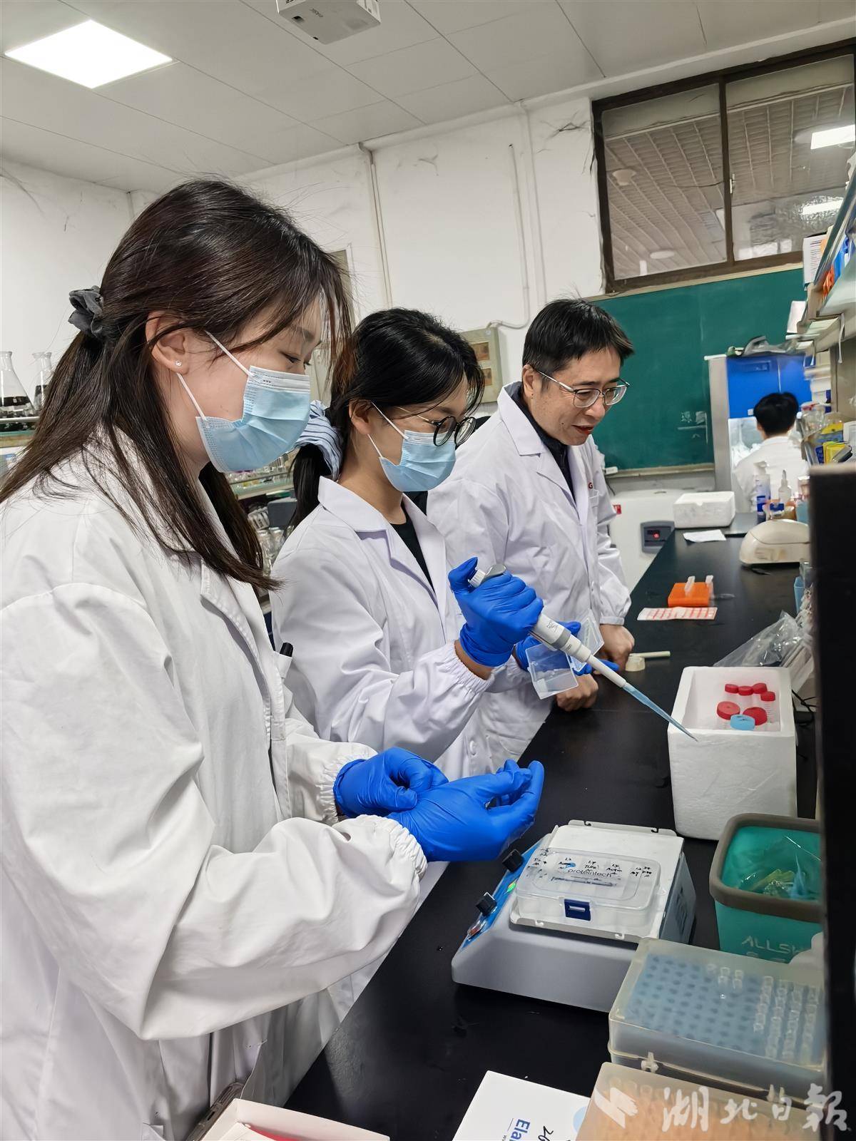 2月7日,湖北时珍实验室刘义飞教授指导两名研究生做实验。(湖北日报全媒记者包东喜摄)