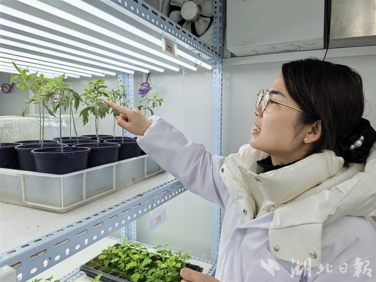 团队成员查看艾叶“芯片”生长情况。(湖北日报全媒记者包东喜摄)
