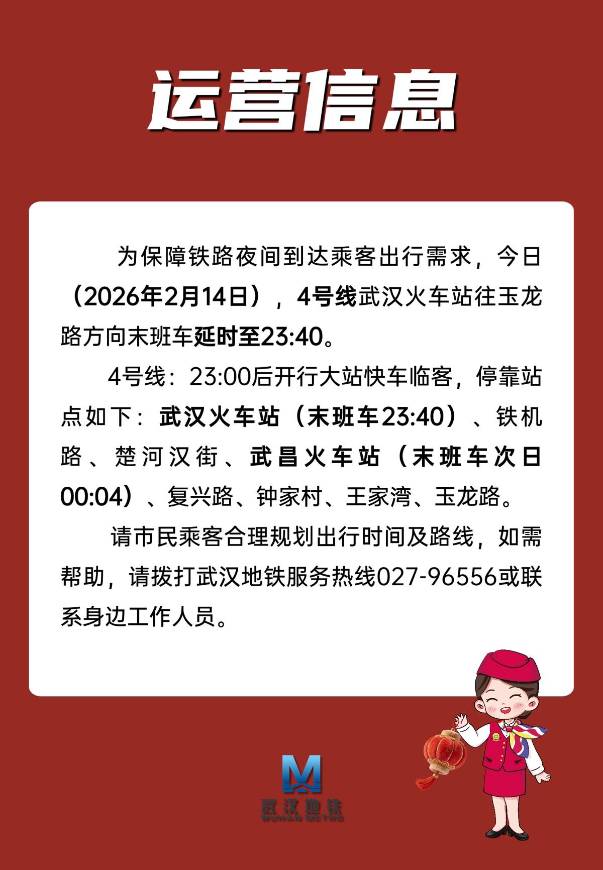 湖北日报讯(记者黄洁如、通讯员李丹、产启斗)为保障铁路夜间到达乘客出行需求,今日(2月14日),4号线武汉火车站往玉龙路方向末班车延时至23:40。