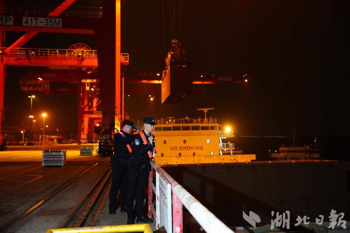 当晚21时30分,船舶平稳靠港后,汉口边检站执勤民警第一时间登轮开展入境查验,快速完成人证对照、船体检查等全流程手续,仅用半小时便办结边检通关业务。随即,码头龙门吊高效作业,船上集装箱有序装卸转运,口岸生产秩序井然。