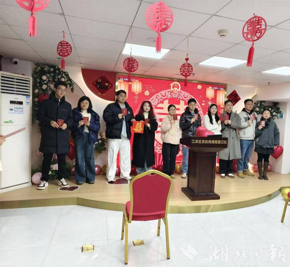 湖北日报讯(记者李光正、通讯员王琳)2月14日,武汉市江岸区民政局婚姻登记处以“缘承四境·婚启新章”为主题,开展婚俗改革系列宣传活动,同步推进结婚落户“一件事”政策宣传与办理服务,打造浪漫温馨的沉浸式领证体验,既让每对新人留下珍藏一生的幸福记忆,也让文明婚俗理念深入人心、惠民政策落到实处。
