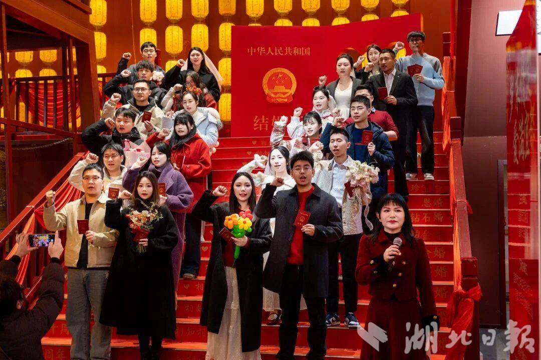 宜都市在鲟龙水街婚姻登记点举办“岁末情定,爱满宜都”新婚集体颁证仪式。(通讯员吴鹰提供)