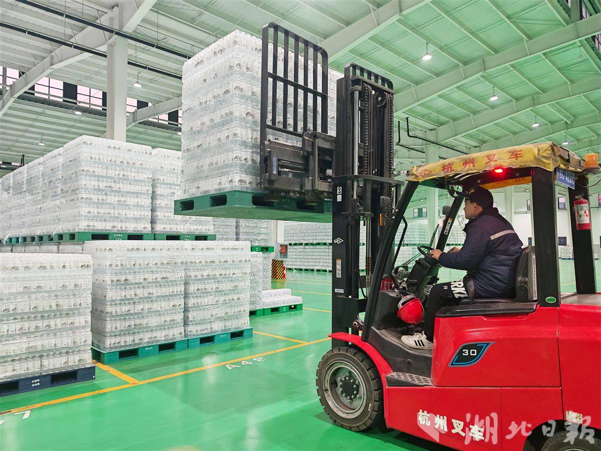 2月13日傍晚,丹江口武当山水饮料有限公司的叉车正在仓库发货。(记者刘天纵摄)