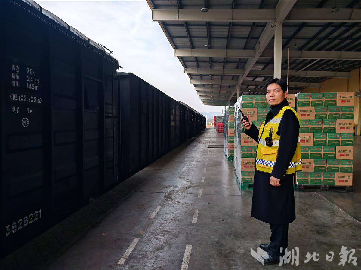 2月13日下午,在丹江口火车站胡家岭调车区,一节节车厢满载瓶装水和饮料。车站安全员孙家政手持对讲机,指挥铁路职工为车厢编组对位,让每一瓶产自丹江口的水,踏上畅快的春运之旅。