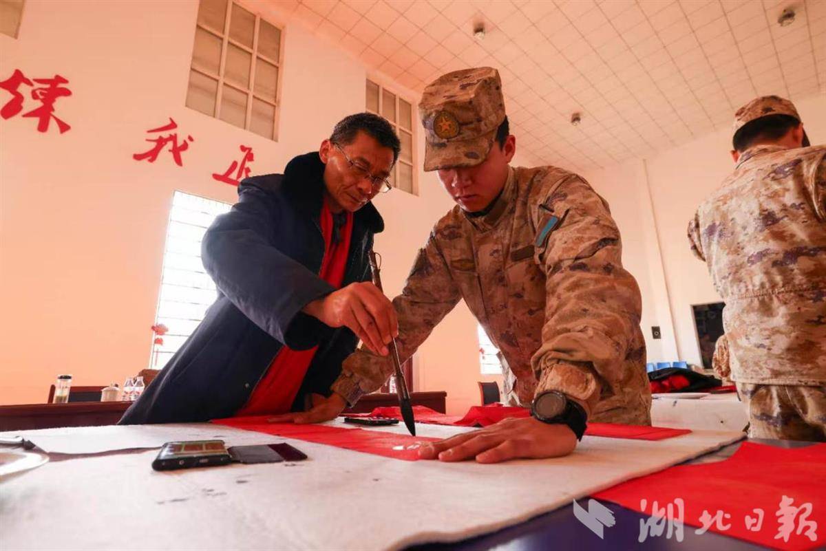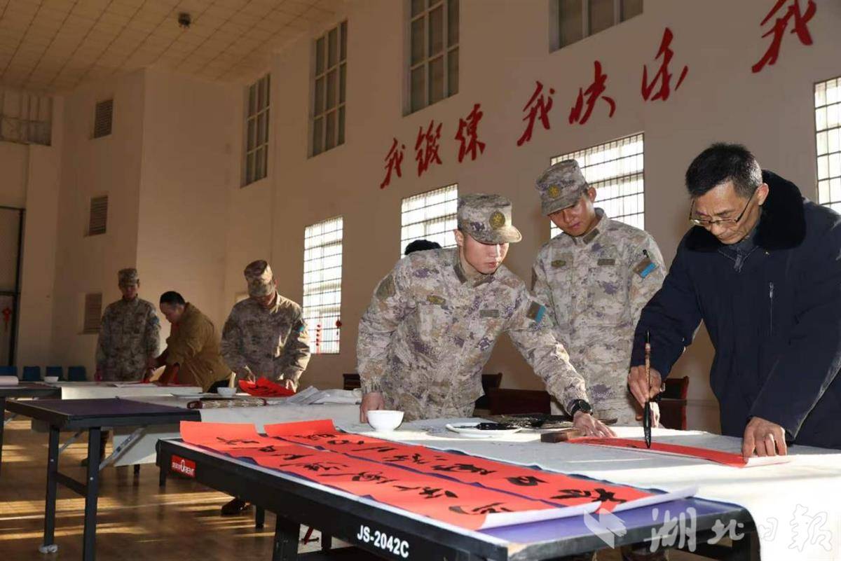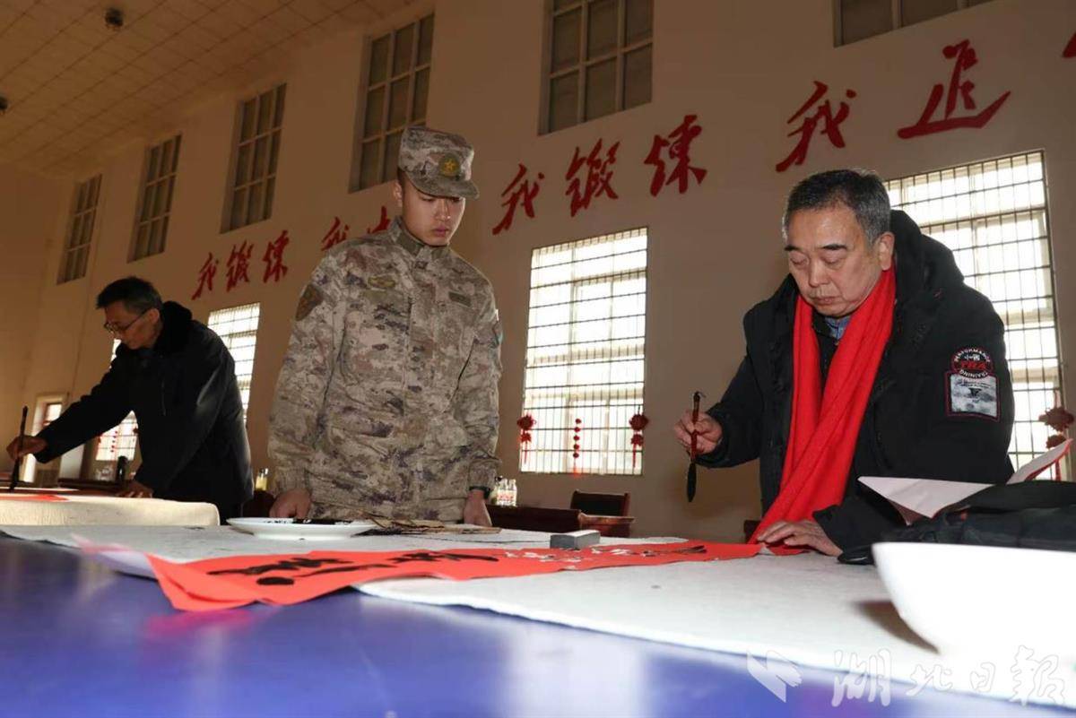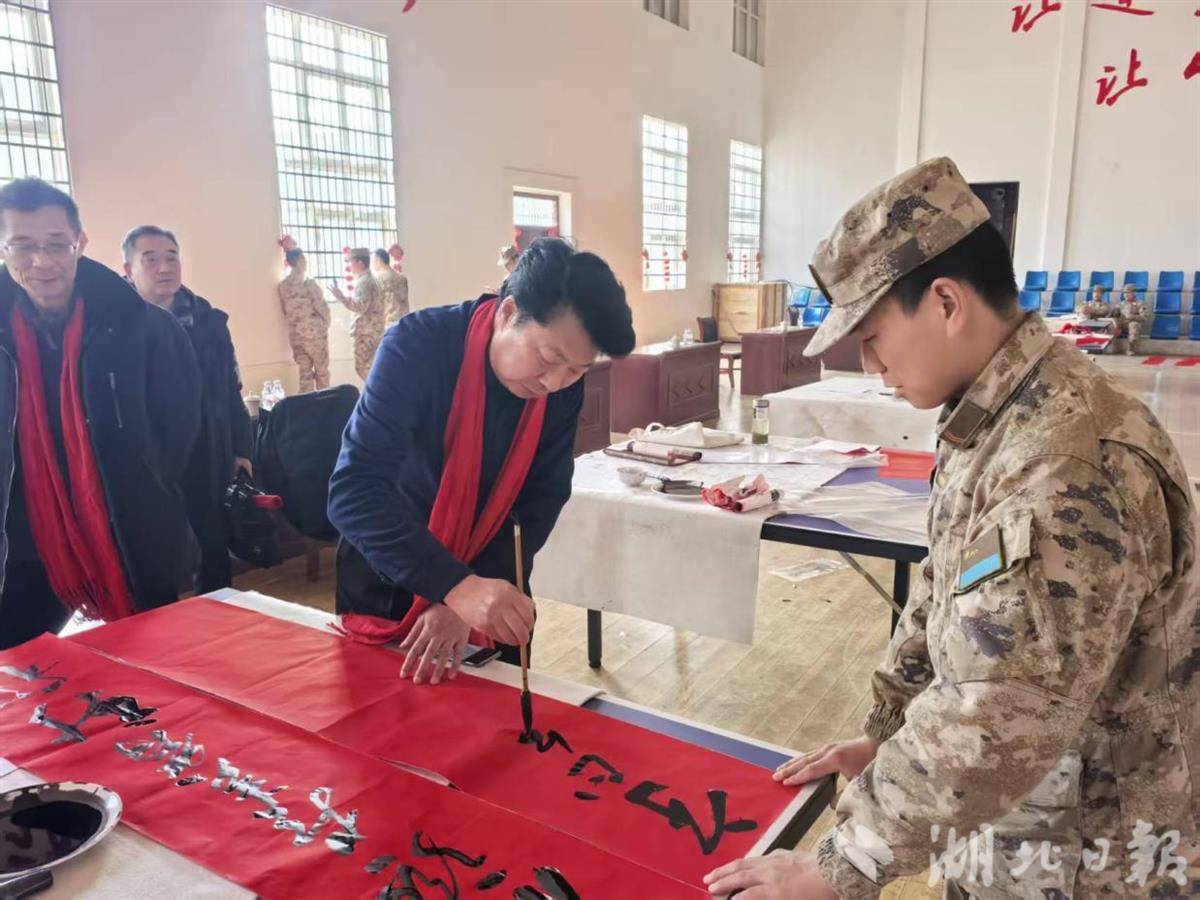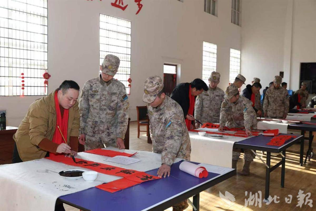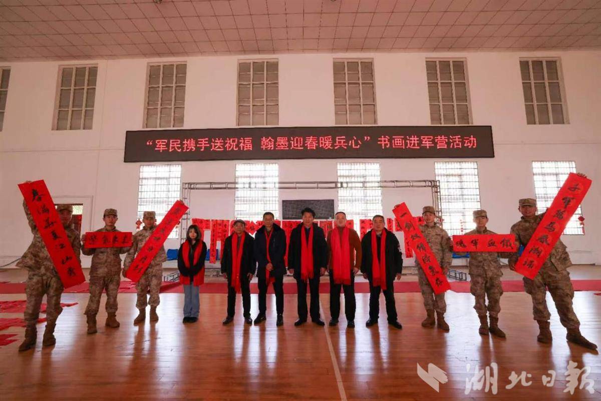 湖北日报讯(通讯员刘小斌、宁煌)2月13日,新春将至,年味渐浓。广水市书法家协会6位书法家走进驻广某部,开展“军民携手送祝福、翰墨迎春暖兵心”书画进军营活动,以笔墨为媒、以文化传情,为坚守岗位的官兵送上新春祝福与文艺暖意,续写新时代军民鱼水深情。