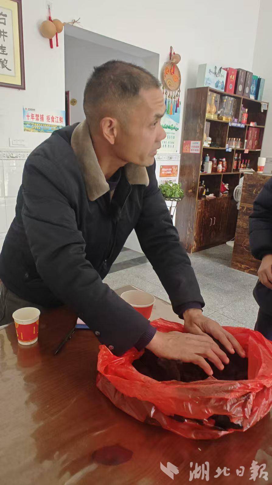 “古井饭庄”厨房里,老板胡清向记者展示当地特产——九蒸九晒的黄精。(湖北日报通讯员 黄铮 摄)