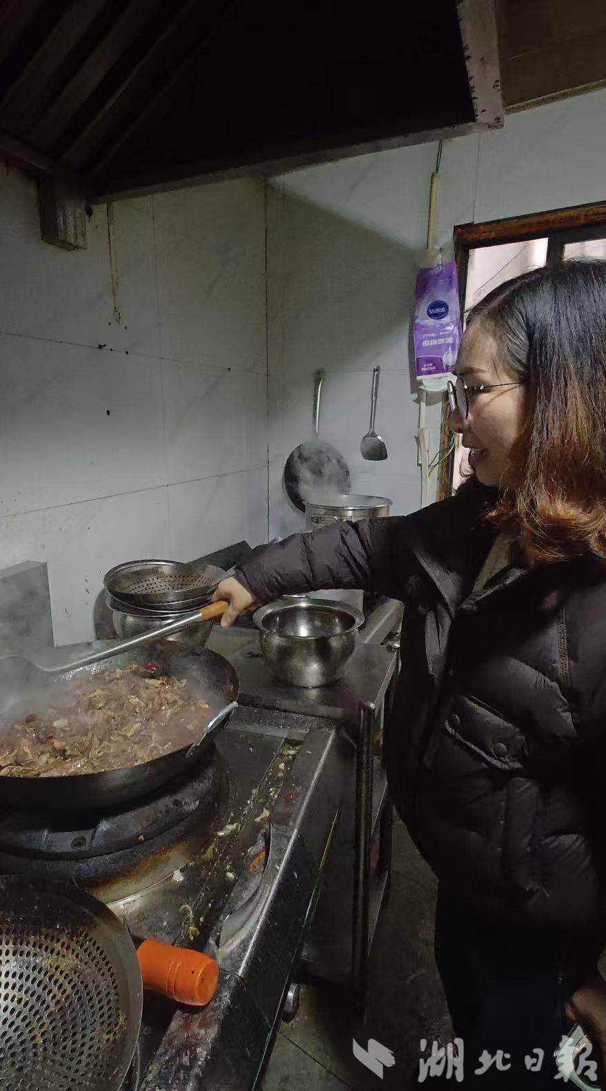 2月11日一大早,“古井饭庄”厨房里,老板胡清和妻子黎兰洲忙个不停。(湖北日报通讯员 黄铮 摄)