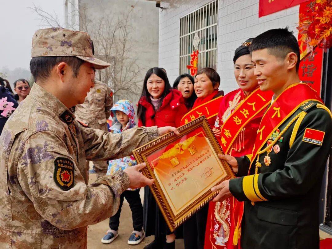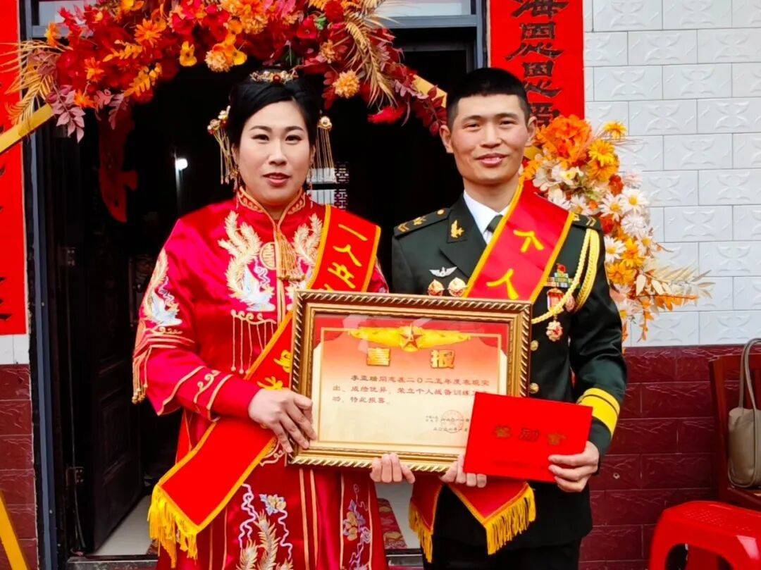 湖北日报讯(记者王孝武、通讯员姚立、实习生邱瀚锦)火红的“囍”字与金色的立功喜报相映生辉,一场特别的婚礼让春节前夕的孝感市大悟县四姑镇横山村充满喜庆气氛。新郎是现役一级上士,新娘是退役军人,送到现场的三等功喜报让这场双军人婚礼更加喜气洋溢。