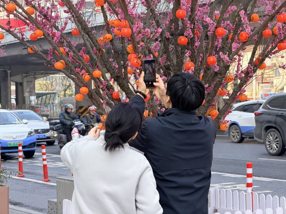 “花开得好,年味也更浓了!”武商MALL门前,现场保安笑着告诉记者,这几天拍照打卡的游客特别多,晚上灯笼一亮,更是热闹,“人流量明显多了,大家都说这梅花来得巧,正好赶上过年”。家住附近的老居民文昌植也驻足轻嗅:“今年第一次在这里看到梅花,香气扑鼻,年味更足了!”