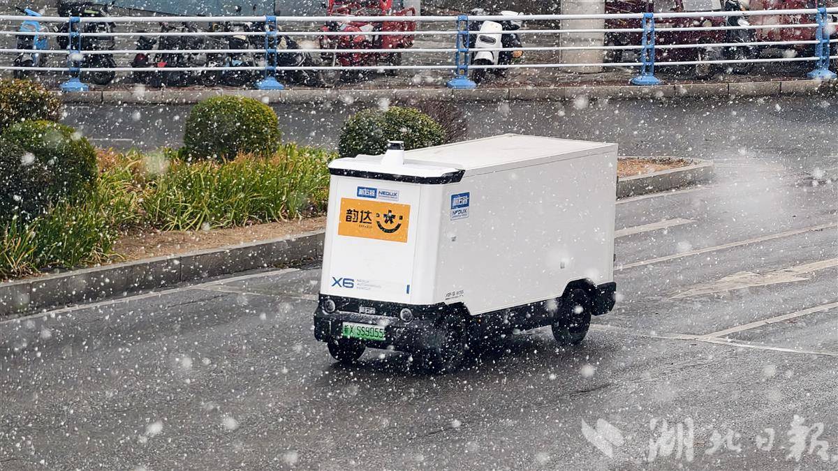 荆门市突降大雪,无人快递车在风雪中平稳行驶。