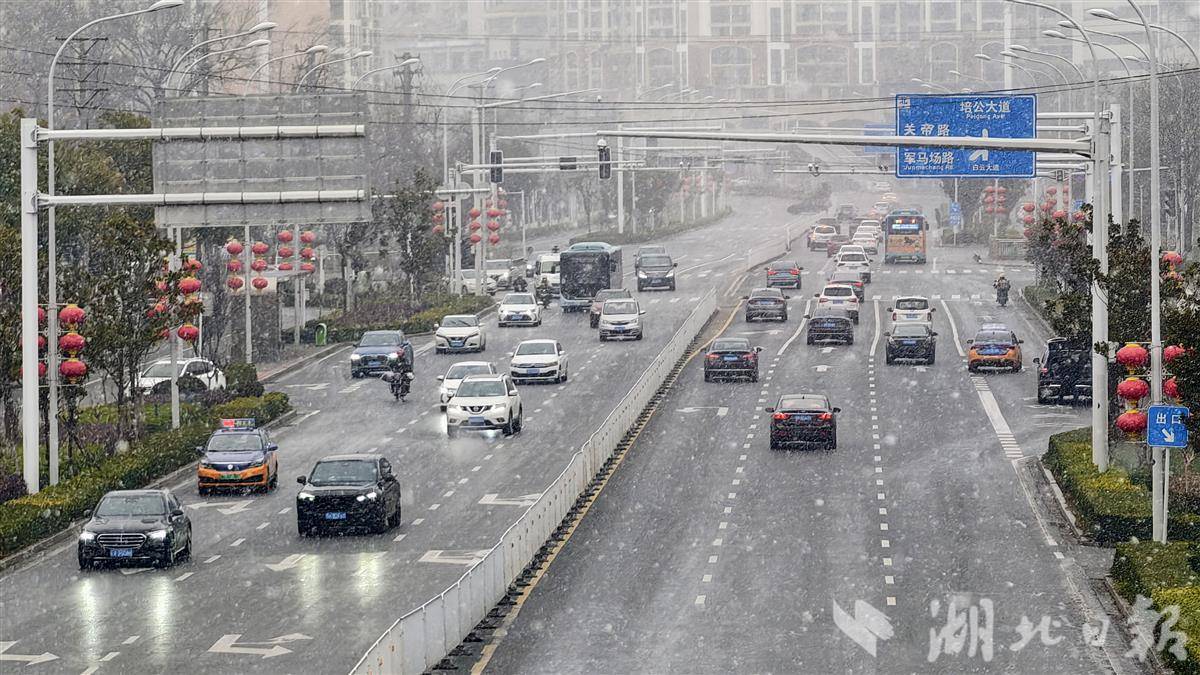 2月16日(除夕)上午9:40,湖北荆门市突降大雪,除夕飞雪为春节增添别样年味,街头红灯笼与皑皑白雪相映成趣。交管部门提醒市民:“出行需防滑保暖,车辆减速慢行”,确保平安迎新春。(湖北日报全媒记者 陈少哲 摄)
