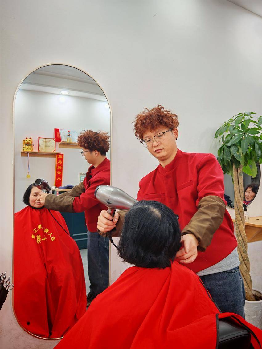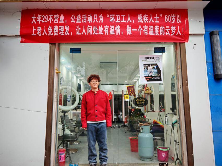 早些时候,黄向就在店铺上方拉出红底白字横幅,上面写着:大年29不营业,公益活动只为“环卫工、残疾人士”60岁以上老人免费理发,让人间处处有温情,做一个有温度的云梦人!