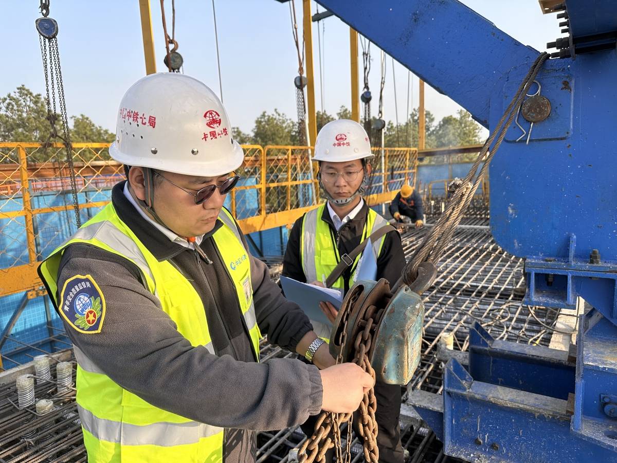 合武高铁湖北段站前5标二分部川龙大道连续梁的施工现场,技术主管李智(左一)与技术员许友良(右一)依然坚守在岗位上。(通讯员雷霄摄)
