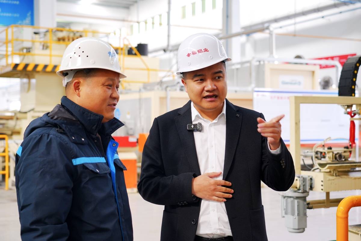 湖北幸福铝业新材料科技有限公司总经理郑杰(右)。(湖北日报通讯员 关洪磊 摄)