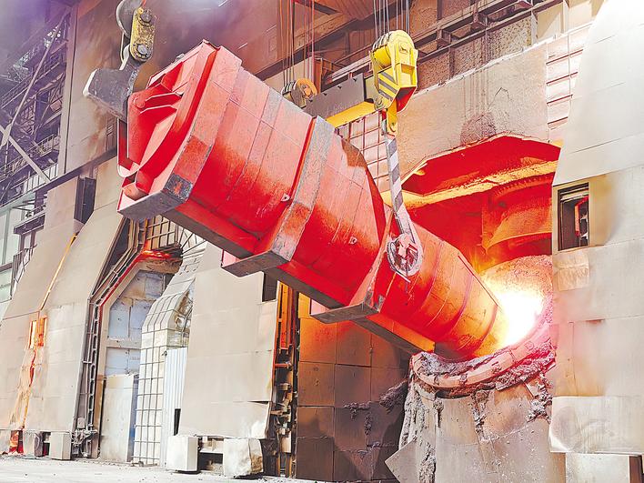还未走近四炼钢厂,已能听到低沉而持续的轰响。进入巨大的钢结构厂房,一股夹杂着金属气息的热浪扑面而来。地面上,铲车奔走忙碌;屋顶上,天车呼啸运转;炼钢区里,铁水蒸腾、钢花四溅……一派热火朝天景象。