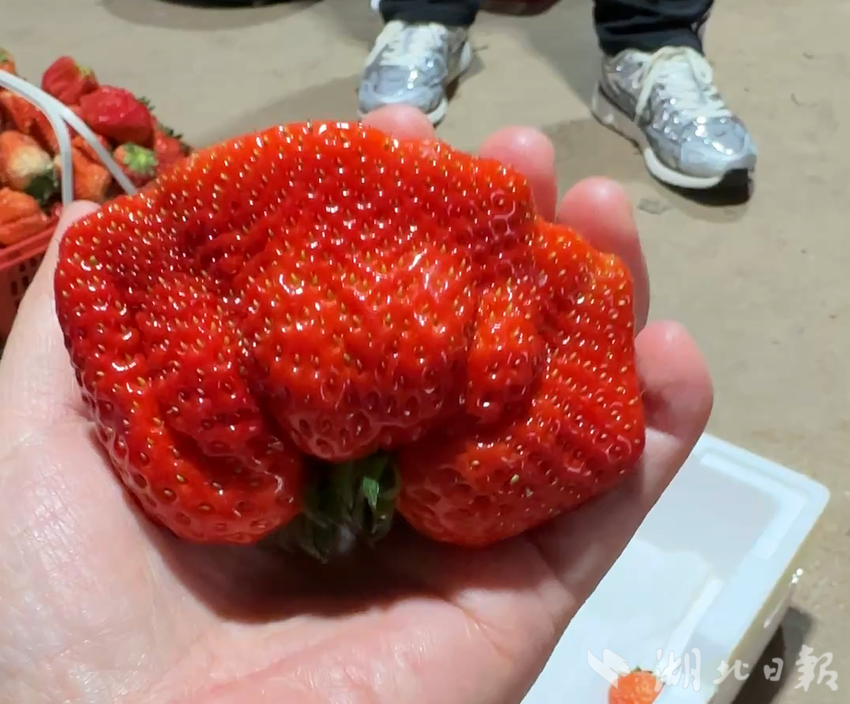 针对消费者关心的异形草莓是否为“激素果”的疑问,汪玉鸿耐心科普:草莓打激素会对整株生效,不可能仅单果变大。异形果多为植株结出的头果,因花期雨天蜜蜂授粉不足、水肥调控等自然因素导致外形差异,但糖分比二果、三果更高。自然成熟的草莓果肉紧实、果香浓郁、果皮厚实;皮薄易破、汁多味淡的草莓,才可能违规使用激素。
