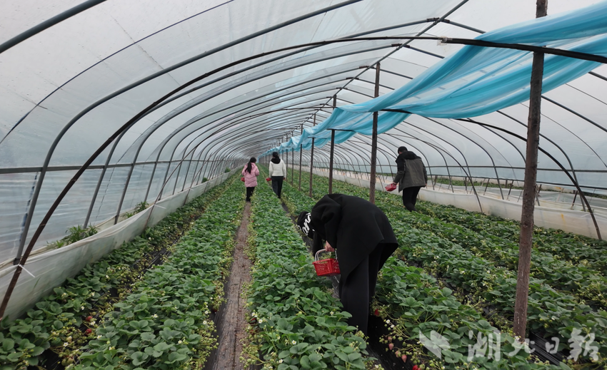 除夕,黄冈市黄州区堵城镇叶路洲余岭村春雨点点,一座座大棚里草莓飘香。浙江籍草莓园老板徐玲燕手把手指导游客采摘:“摘这样的大果、红果,沿莓蒂果柄留手指甲盖长掐断,保鲜更久!”翠绿藤蔓间,颗颗草莓鲜红饱满,恰似串串灯笼。这已是徐玲燕、汪玉鸿夫妇扎根黄州种草莓的第8个年头。春节假期,是他们一年中最忙碌、也最喜悦的时光。