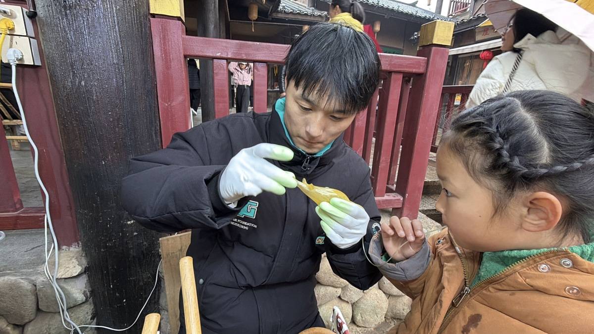 春节假期头三天,张小荣的摊位前围满游客。马年生肖面塑、可食用福袋娃娃等爆款产品供不应求。“现在的游客买的不只是手工艺品,更是参与的快乐和情感的寄托。”张小荣说。