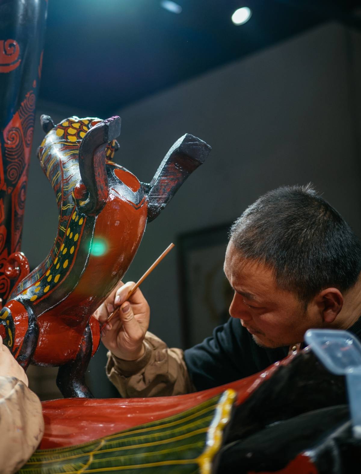 襄阳市传统漆器博物馆馆长隗鹏为雕塑上漆。(采访对象供图。)