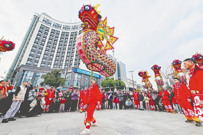 武汉汉阳街头,非遗高龙霸气巡游迎马年。(湖北日报全媒记者 李溪 摄)