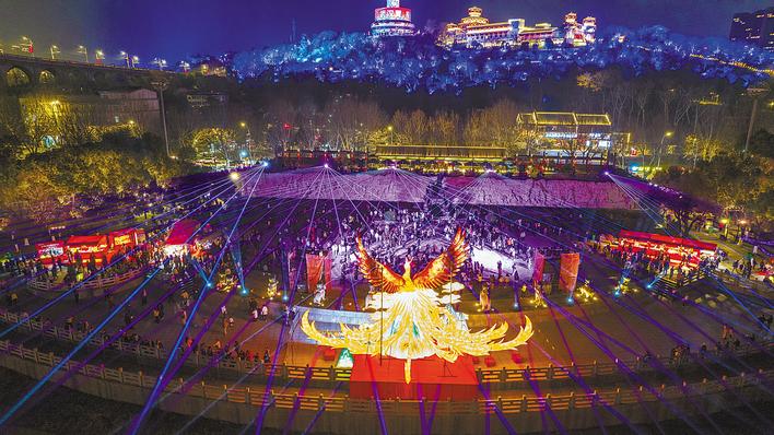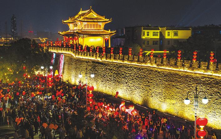 襄阳古城“千灯临汉 万户迎春”活动,流光溢彩,点亮千年襄阳夜空,喜气漫卷汉江两岸。(视界网 王虎 摄)