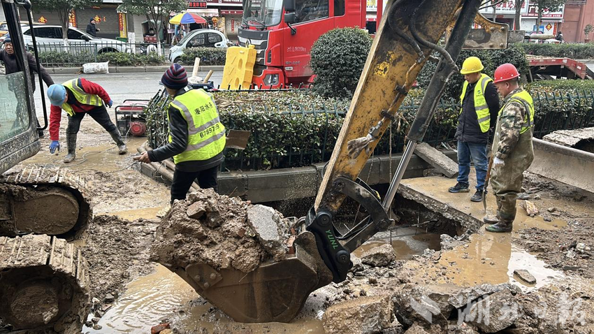 下午3时,全天候备勤的维修班组抵达现场。仔细勘查发现,这是一条2008年铺设的水泥管道,因道路两次改造后路面抬高近一米,如今深埋于4米之下的绿化带内。大型机械难以施展,只能靠人工轮番下坑挖掘。20余名抢修队员、9台机械设备迅速集结,在除夕的街头,一场与时间赛跑的抢修悄然打响。
