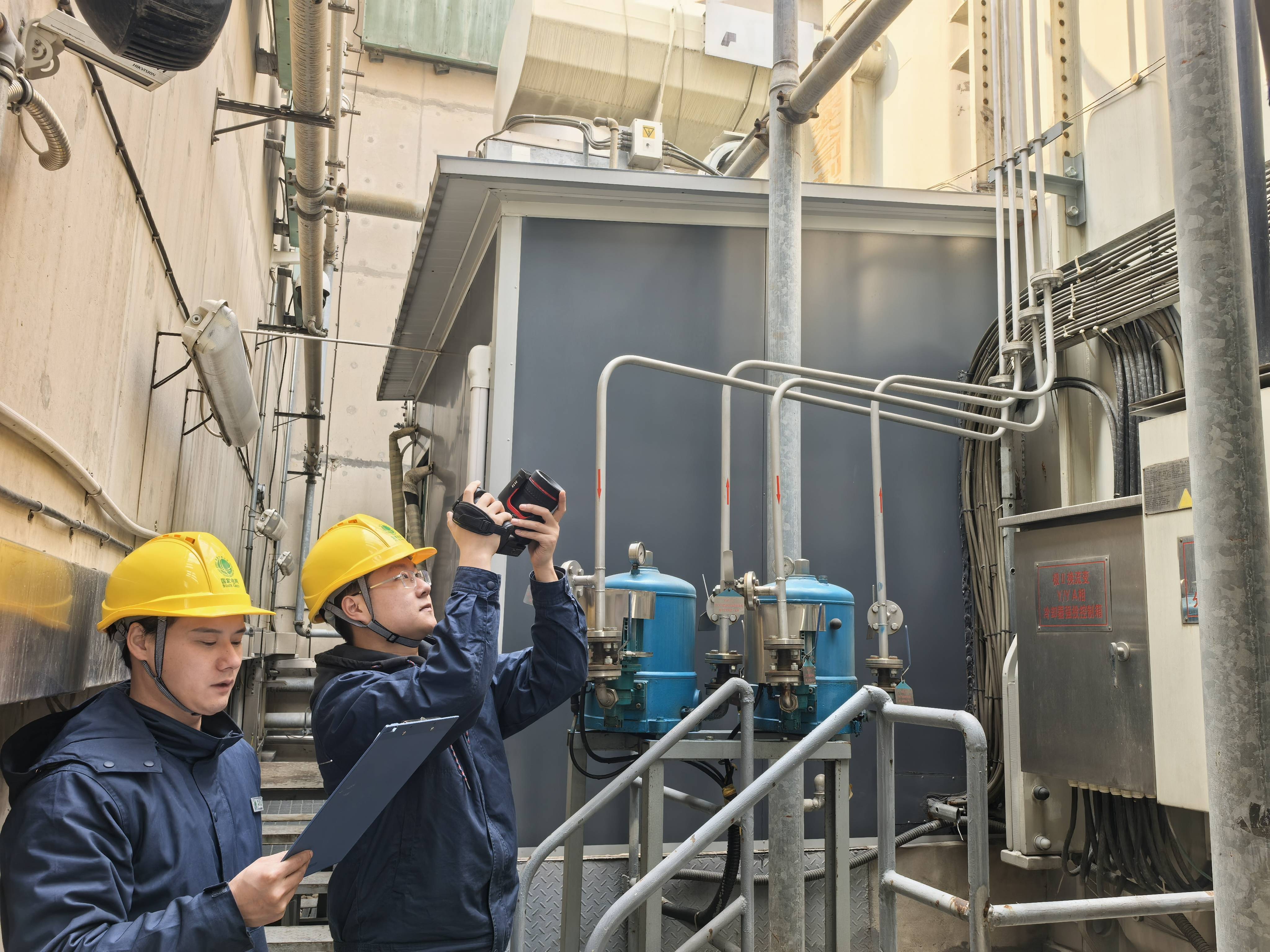2月15日,±500千伏江陵换流站运维人员胡哲豪、余鹏程正在对换流变潜油泵进行红外测温
