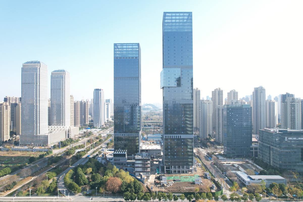 汉阳“双子塔”高楼穿上“玻璃外衣”。通讯员 凌海兰 摄
