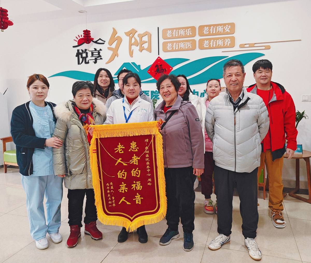 新春清晨,陈建华书记与医护人员早早忙碌起来,将一碗碗热腾腾的饺子送到住院老人和医养中心长辈手中。她紧紧握着老人们的手,送上新春问候与拜年祝福,同时叮嘱医护人员悉心照料,让老人们在院也能感受家的温暖。就在慰问进行时,康先生一家带着鲜红的锦旗走进医养中心,让现场暖意加倍。