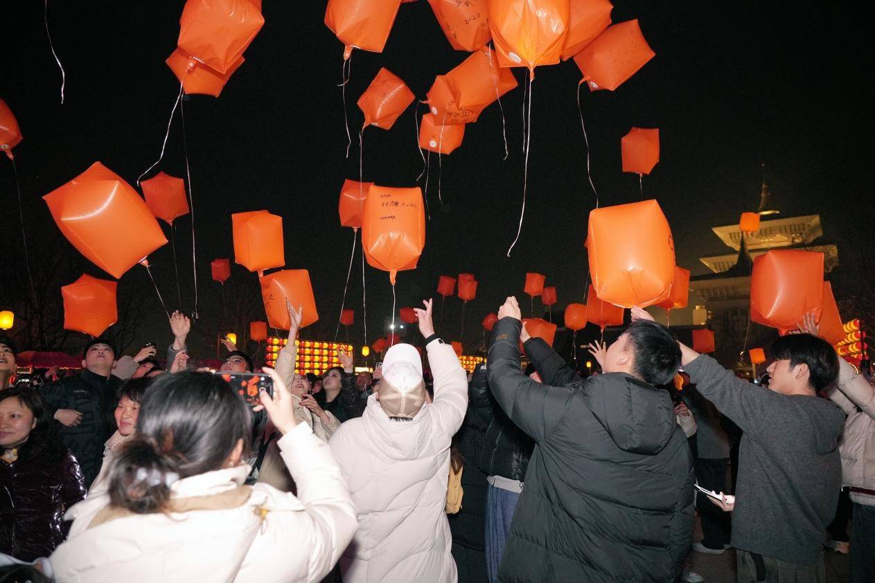 来自武汉的游客叶女士牵着孩子的手,轻轻放飞手中的孔明灯:“我们在灯上写下了‘国泰民安’的愿望,看着灯光越飞越高,感觉特别美好、特别有希望。”