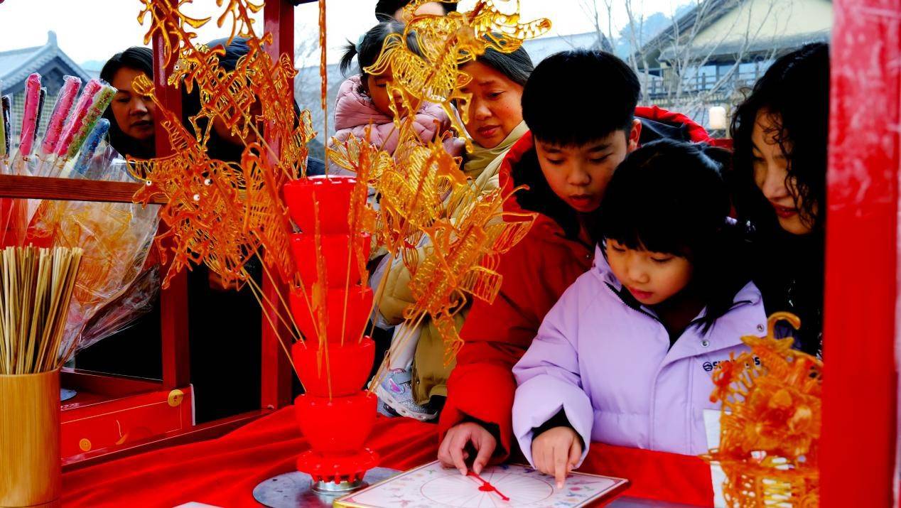 浓厚的年味不仅弥漫在夜空,更贯穿于整个景区年俗体验中。石板路上,鱼灯巡游队伍婉转穿梭,天仙广场市集的糖画师傅以勺为笔,勾勒出“龙马精神”等吉祥纹样,甜香与烟火气交织,酿成独特的味觉记忆。