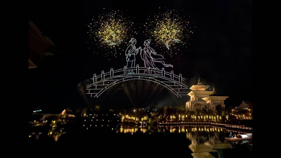 无人机焰火遇见非遗国潮 东山问梅村春节玩转科技+文化