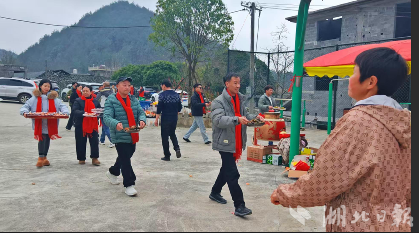 清晨,锣鼓声率先打破山寨的宁静。院落里的锣鼓爱好者们摆开阵势,一通开场土家贺喜锣鼓敲得震天响,将散居在各处的族人聚拢到广场。篮球场上,几个少年已经跑热了身子,正轮番上篮;厨房方向炊烟袅袅,捐来的猪肉在锅里翻滚,新鲜的蔬菜在案板上码放整齐——这场完全由族人自筹、自办、自演的新春团年宴,就此拉开帷幕。