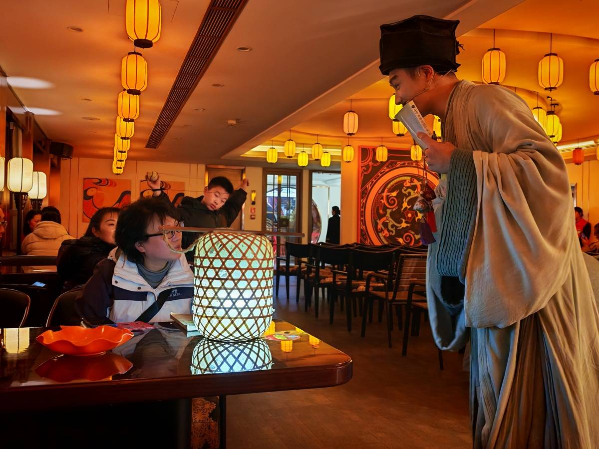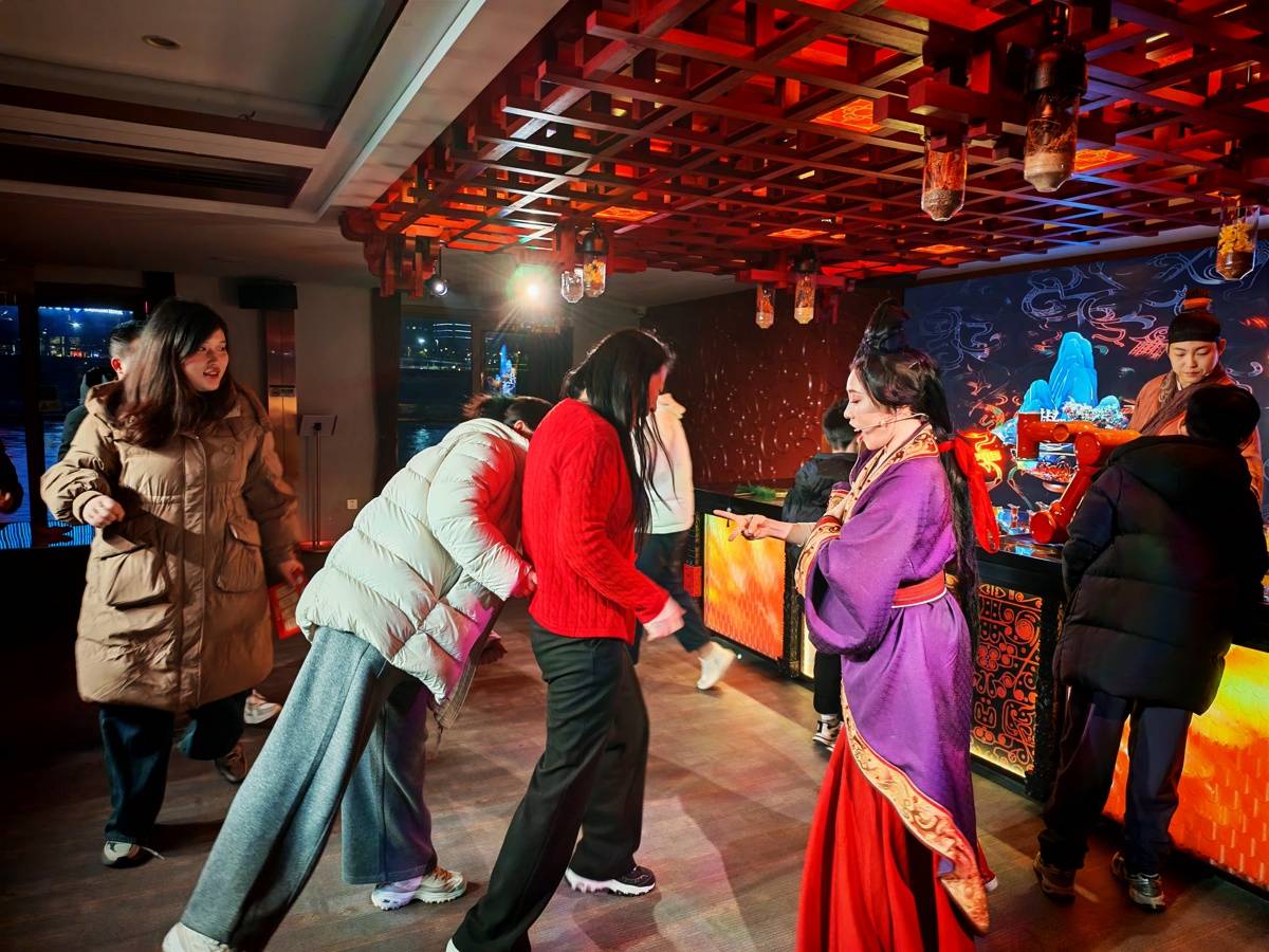 甲板上的风带着江水的湿润,两岸的灯光秀次第亮起,磨基山的轮廓在夜色中若隐若现。船行至镇江阁附近掉头,岸上的楼宇灯光倒映在江心,像是撒了一把碎金。船舱里,《灯笼台·古风夜话》正热闹上演,扮演陆游和屈原的演员手持宫灯,你一言我一语地逗趣,时不时抛出一个诗词接龙,答对的观众能拿到一枚古风香囊。一对年轻夫妻被请上台,配合演员变魔术,慢半拍的反应惹得台下观众会心一笑。