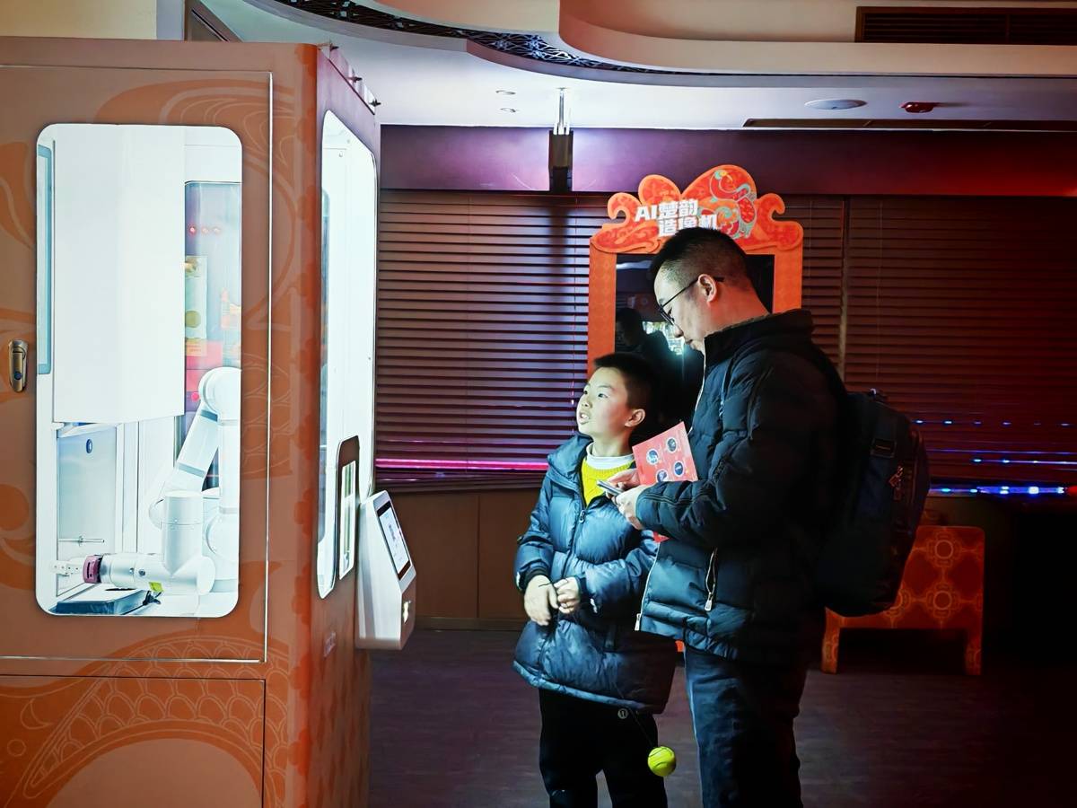 “来,谁赢了这一局,就能喝到AI机械臂调的特饮!”三楼的古风喜剧《酒肆·三献之礼》让游客们进入一场欢乐的沉浸式互动。酒馆老板娘一袭红裙,和店小二插科打诨惹得观众笑声连连。最吸引眼球的,是舞台前方正在忙碌的AI机械臂——它稳稳地握住酒壶,灵活地上下翻飞。演员热情地邀请观众上台互动划拳,台下的小朋友们争先恐后地举手,一本正经地和老板娘划拳,输了就再来一回。