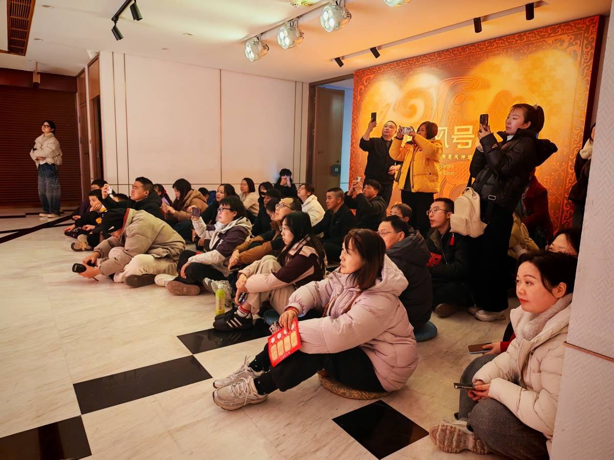 游客坐在蒲团上观看大秀《羽梦千年》