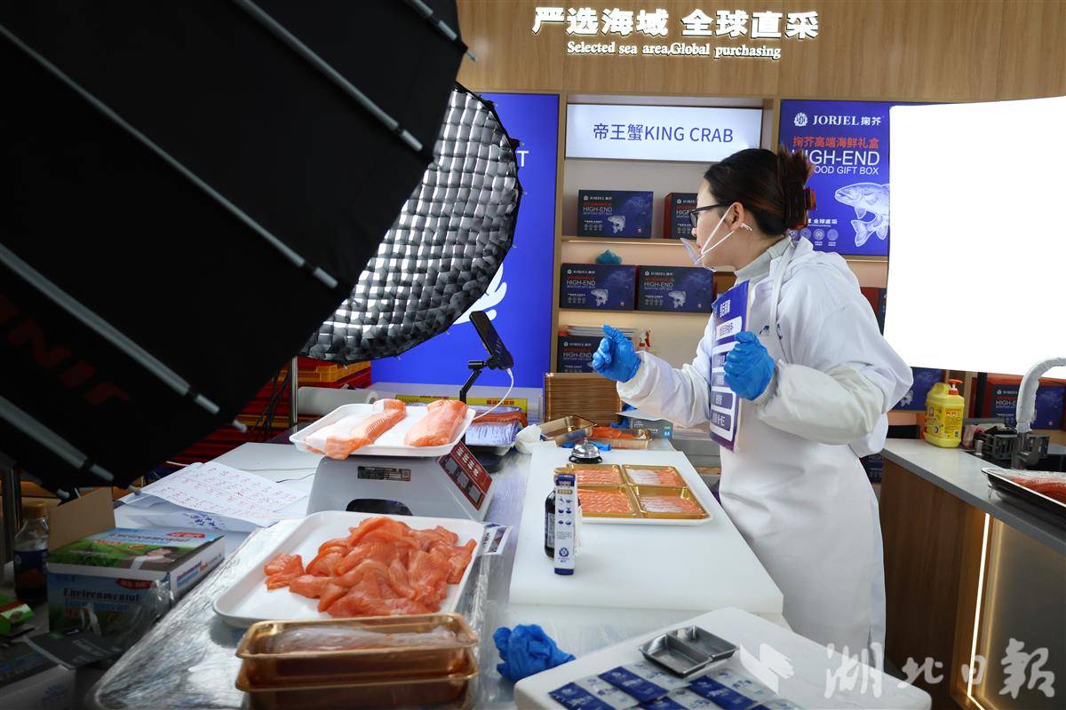 在工厂自建的直播间里,主播们面对镜头激情推介:“家人们,这是来自挪威、冰岛的冰鲜三文鱼,从鄂州花湖机场发出,新鲜直达……”屏幕上,后台订单如同梭子一样不停地弹跳刷新。