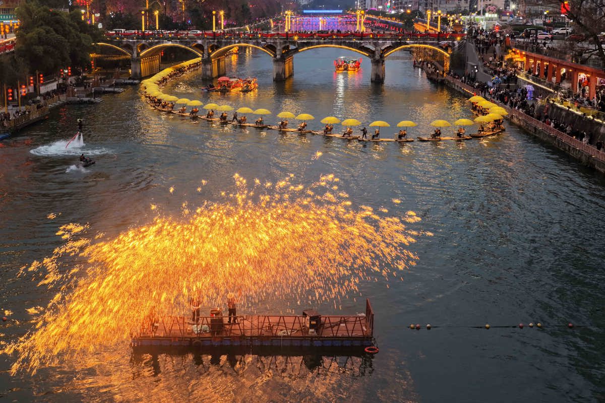 游客在贡水河畔,乘坐游船观看打铁花表演。