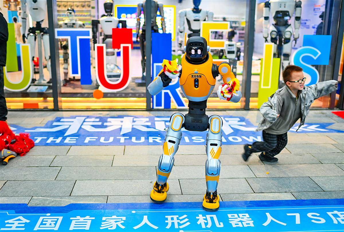 11月11日,全国首家人形机器人7S店在武汉光谷创新天地商业公园开业,机器人在跳舞。