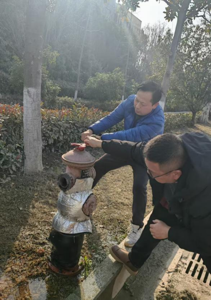 在阳逻的一处户外消防栓旁,两名工作人员正俯身忙碌。他们仔细检查消防栓的阀门、接口等关键部位,拧紧松动的部件,测试出水压力,确保在紧急情况下能够“拉得出、用得上”。为了应对冬季低温天气,防止消防栓冻裂影响使用,他们还为设备包裹了保温层,用专业的防护措施筑牢安全防线。
