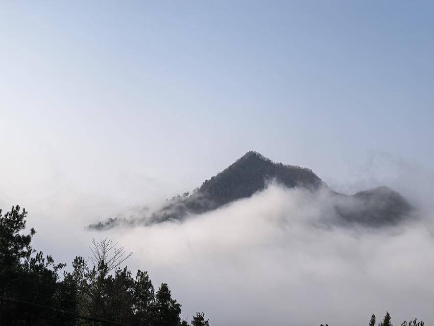 天光微熹,淡青色的天幕下,乳白色的晨雾从深邃的谷底缓缓苏醒,如丝如缕,轻盈地攀附在山峦之间。它们时而如轻纱曼舞,缠绕着墨色的山体;时而如素绢铺展,将整座山峦温柔地拥入怀中。放眼望去,但见云雾翻涌,似乳白色的海洋,只露出几座山峰的顶端,如仙岛般浮沉于云海之上,在淡蓝色天幕的映衬下若隐若现,恍若海上蓬莱。