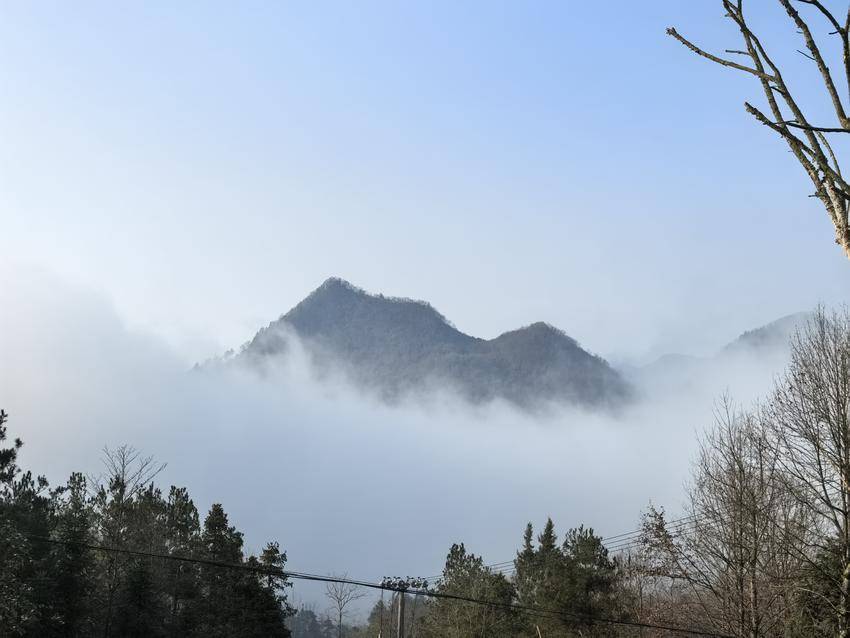 随着时间推移,雾气开始变幻莫测。有的如瀑布倾泻,从山坳间倾泻而下;有的如白鹤展翅,在山腰间盘旋起舞;还有的如薄纱轻拢,将农舍田园笼罩其中,若隐若现,远山如黛,近树含烟,构成了一幅动静相宜的水墨长卷。